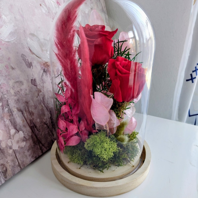 Belle cloche en verre contenant des roses stabilisées rouges, des végétaux secs et stabilisées, pour une belle surprise.