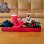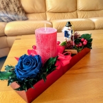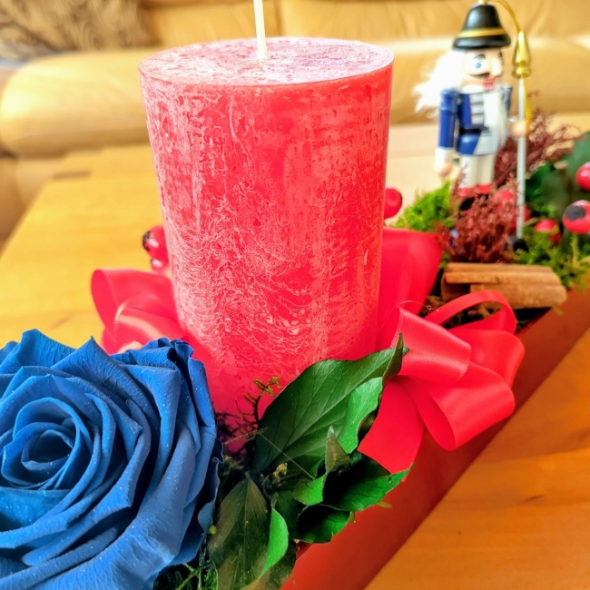 Arrangement avec bougie rouge, éléments stabilisés, secs et artificiels.