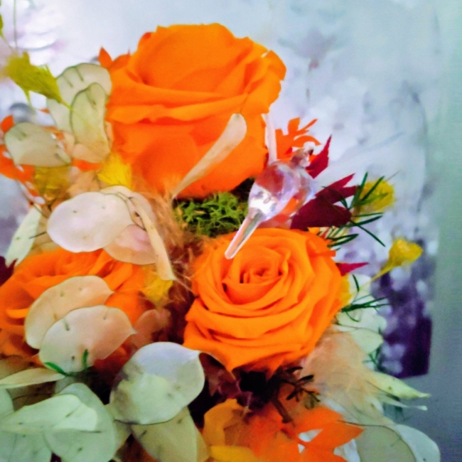 Coupe en verre décorée de roses stabilisées oranges, avec végétaux sec et stabilisés, un magnifique cadeau.