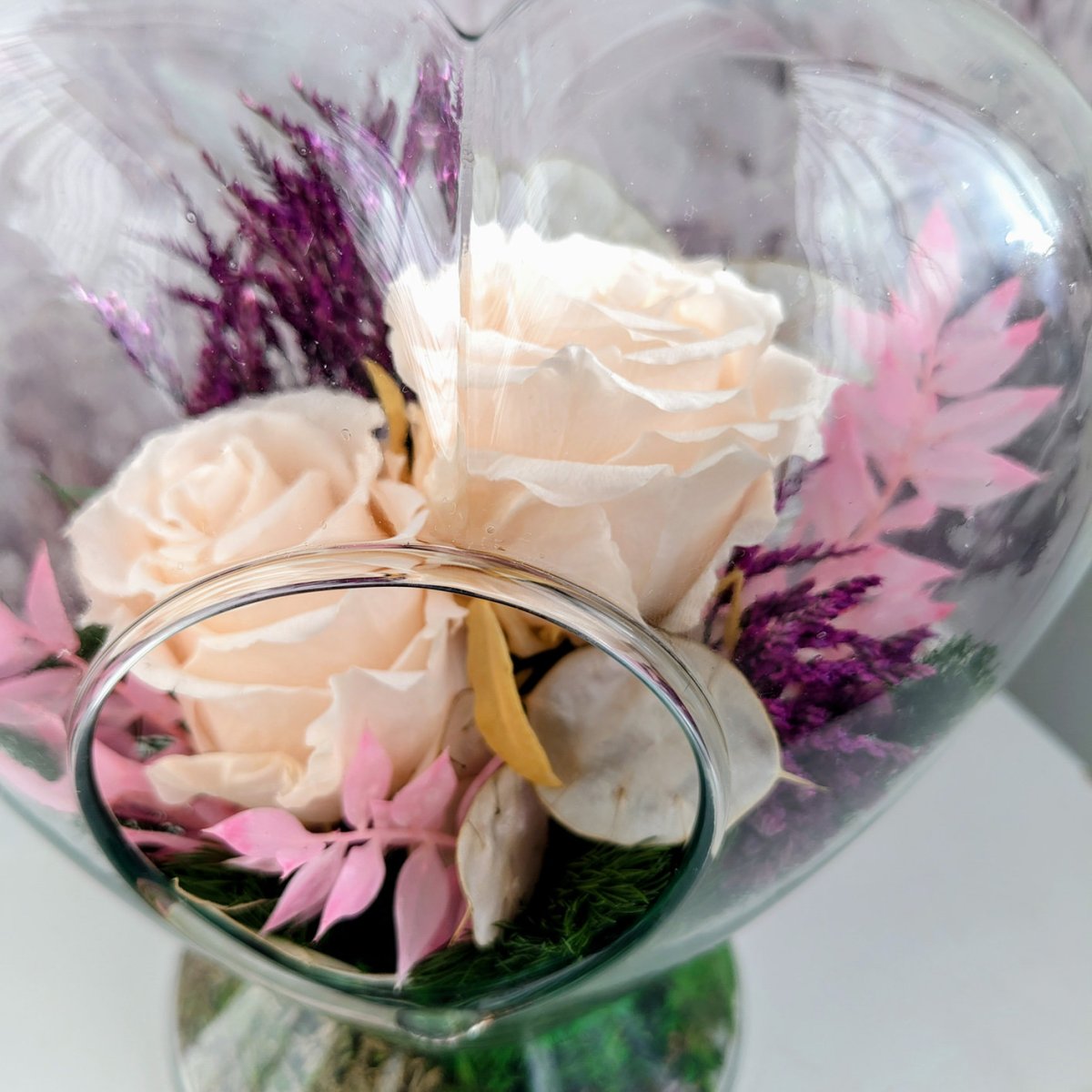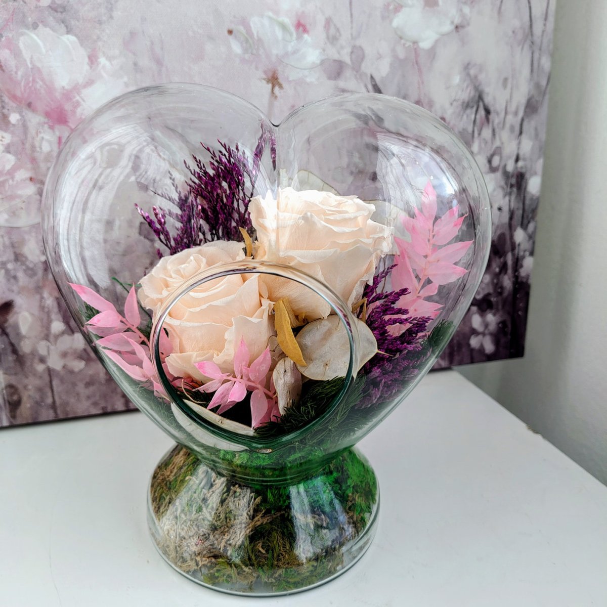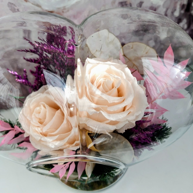Coeur en verre avec deux roses saumon clair, composé de végétaux secs et stabilisées, 100% naturel et ne demande aucun entretien.
