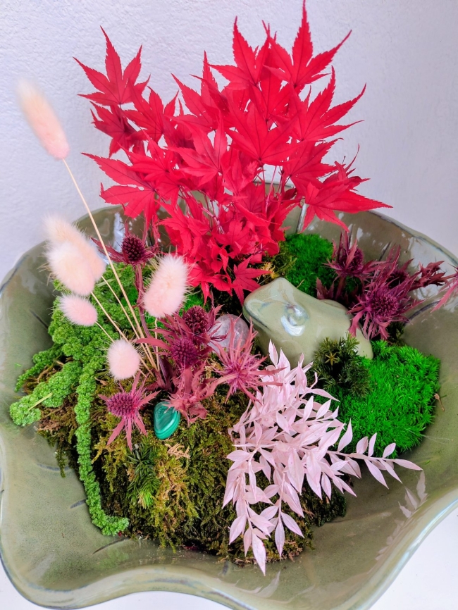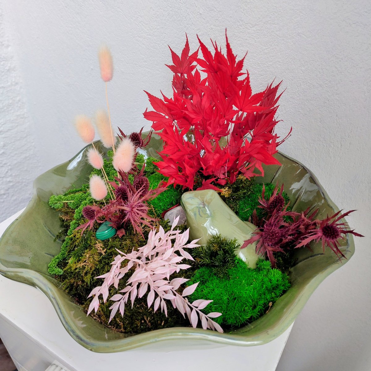 Cette magnifique coupe avec une grenouille intégrée, des végétaux secs et stabilisés, magnifique cadeau à offrir.
