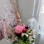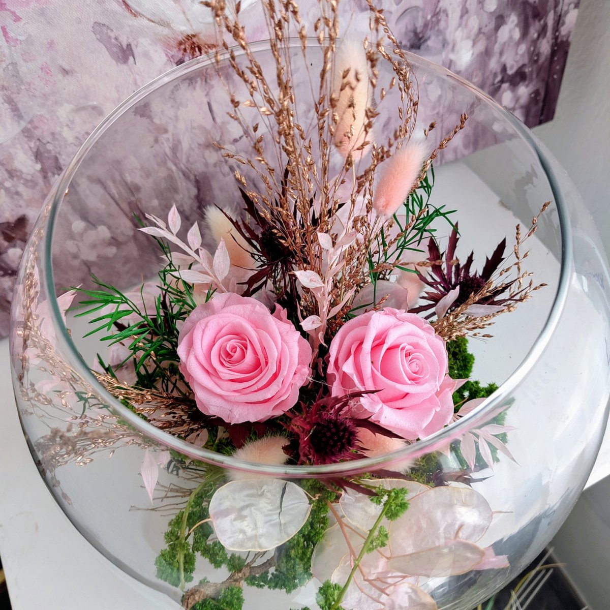 Belle coupe en verre dans les tons pastel, ce magnifique arrangement contient deux roses roses, et des végétaux secs et stabilisées, pas d'arrosage et 100%naturel, un magnifique cadeau.