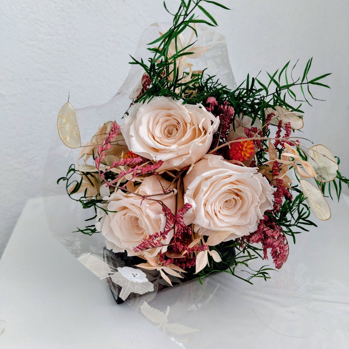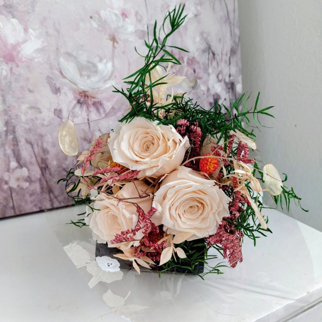 Magnifique bouquet avec des roses stabilisées saumons, accompagnée de fleurs séchées pour un magnifique cadeaux.