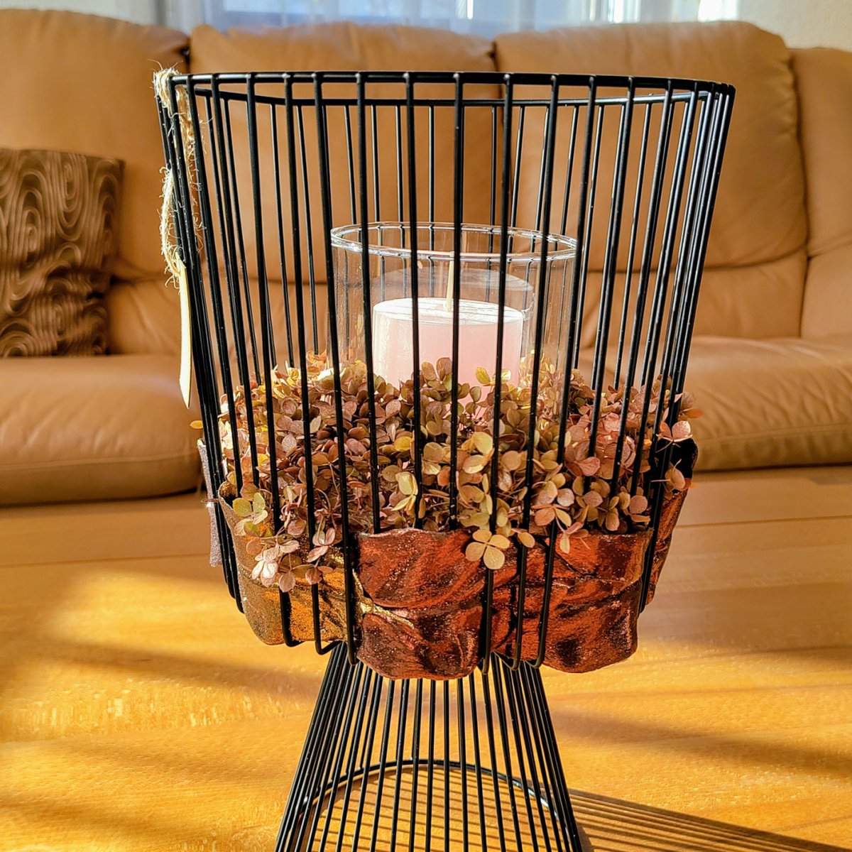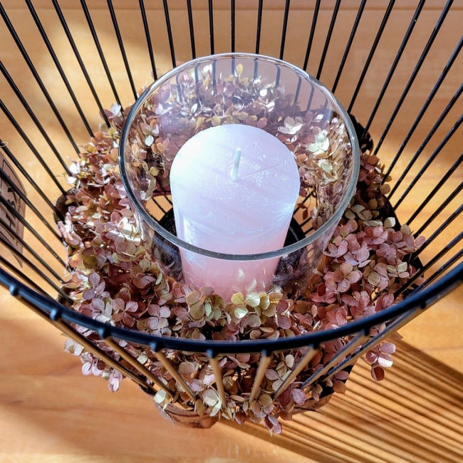 Dans cette composition vous avez une armature en métal noir, décoré avec des hortensias séchées et des feuilles dorées artificielles dorée, à l'intérieur une base en verre avec une bougie, c'est une décoration que vous pouvez garder d'année en année dans un endroit sec.