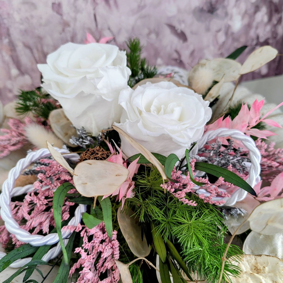 Joli arrangement dans une coupe dans les tons blancs, avec deux roses stabilisées blanches et des végétaux secs et stabilisées, 100% naturel et dure plusieurs années sans aucun entretien.