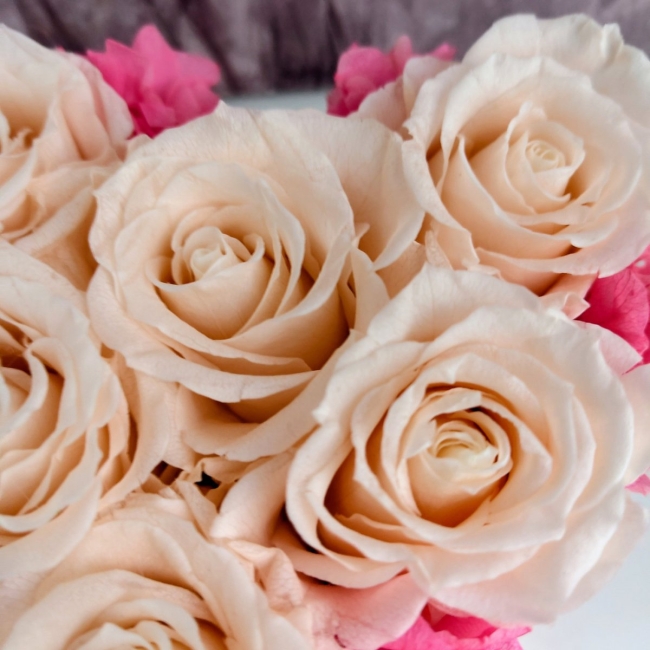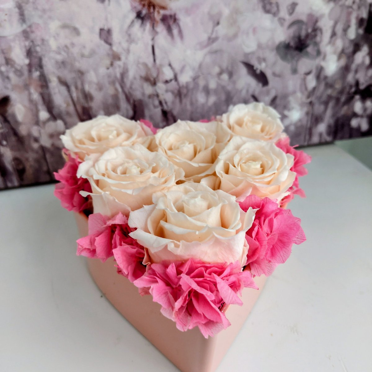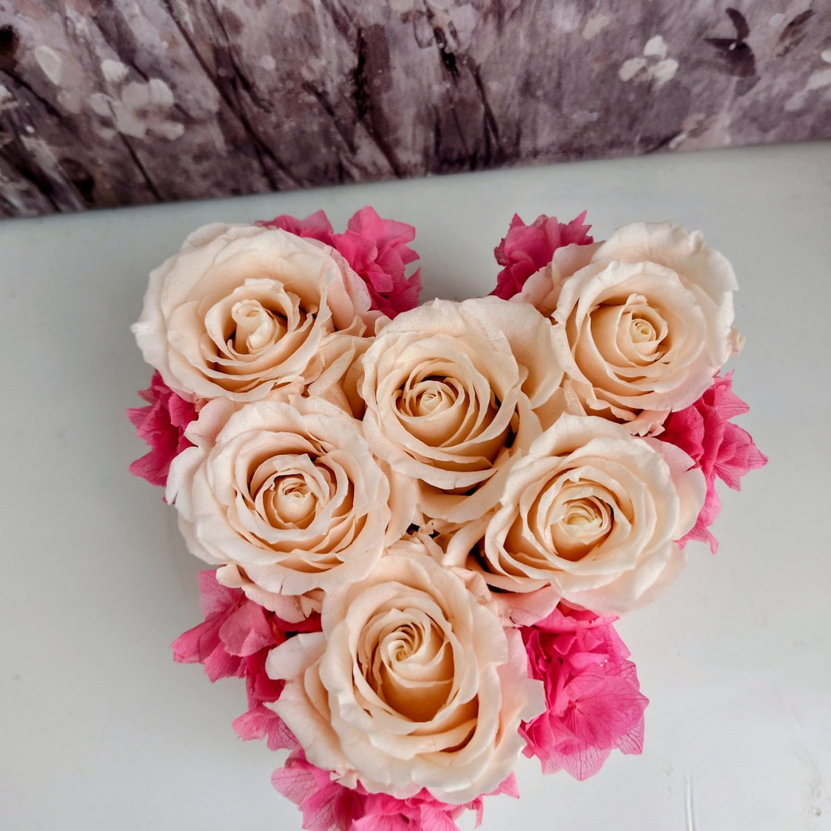 Cette boîte rempli de roses et d'hortensia stabilisées fera un magnifique cadeau, à offrir avec beaucoup d'amour et de tendressse.