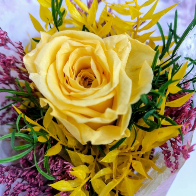 Ce petit bouquet se compose d'une rose stabilisée au centre, accompagnée de fleurs séchées 100% naturel et qui durent plusieurs années sans aucun entretien.