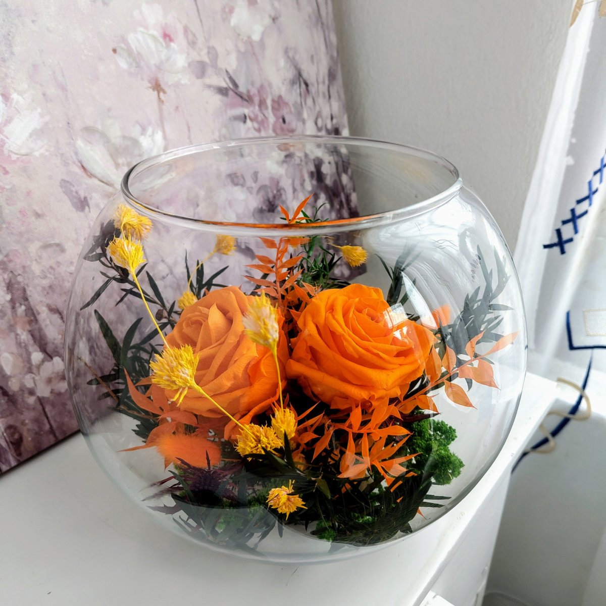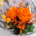Belle coupe en verre, composée de deux roses oranges oranges, stalilisées et des végétaux secs, vous pouvez garder pendant plusieurs années sans aucun entrien.