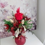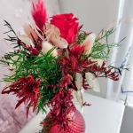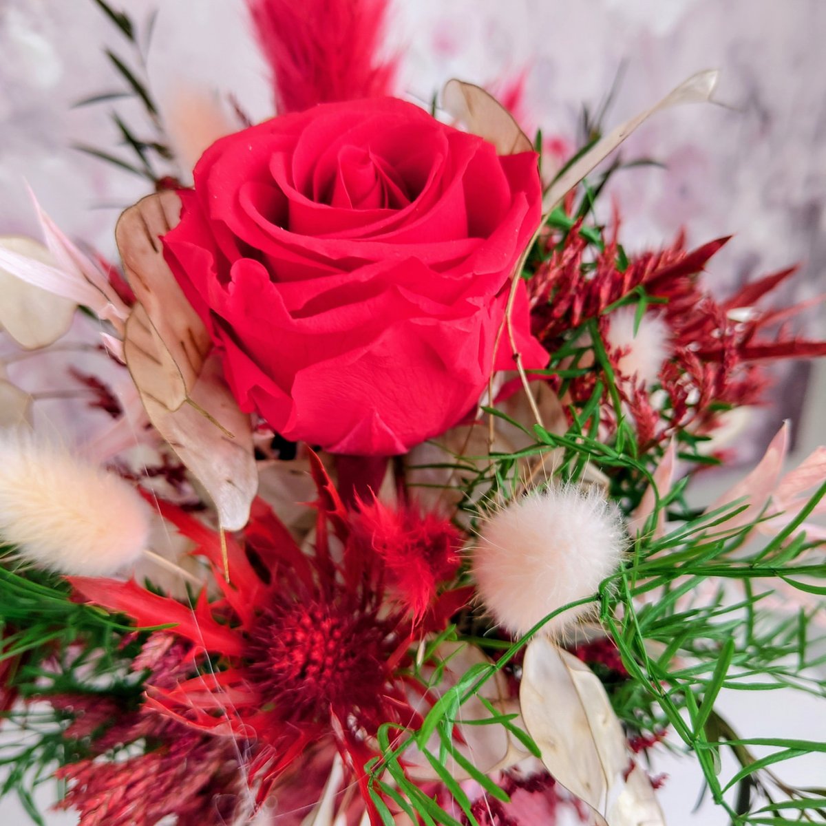 Ce magnifique bouquet avec une rose rouge et des végétaux secs et stabilisés, se sont des produits naturels et durent plusieurs années, le vase est compris dans le prix.