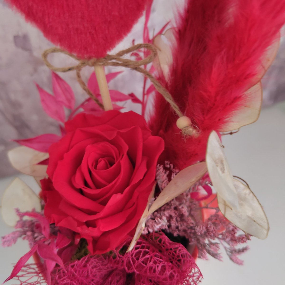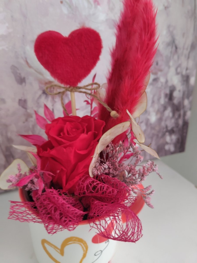 Une joli tasse fleuri dans les tons rouges, pas d'entretien et dure plusieurs années, pour la fête des mères, ou toutes autres occasions.