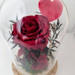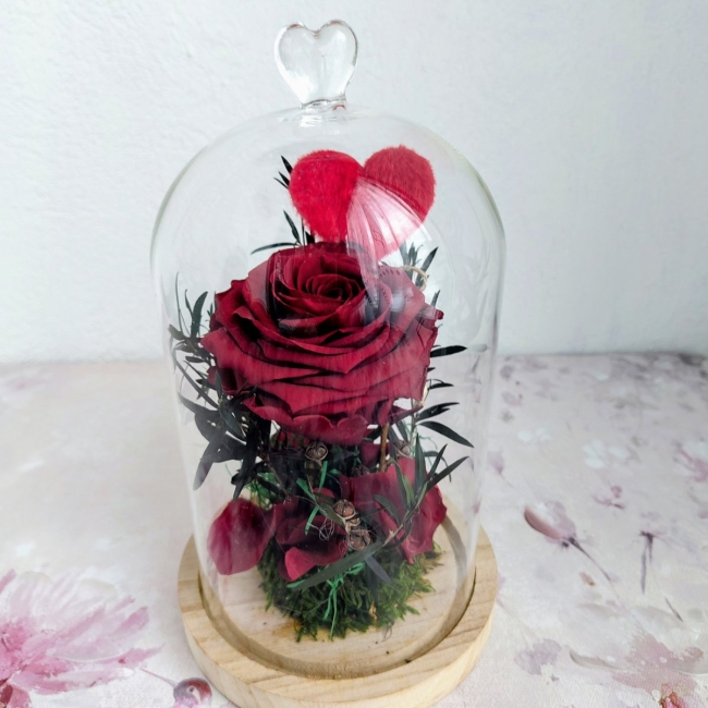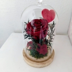 Cloche en verre avec une rose stabilisé rouge et d'autres végétaux aussi stabilisés et 100% naturel pas d'entretien , magnifique cadeau pour la Saint Valentin ou toutes autres occasions.
